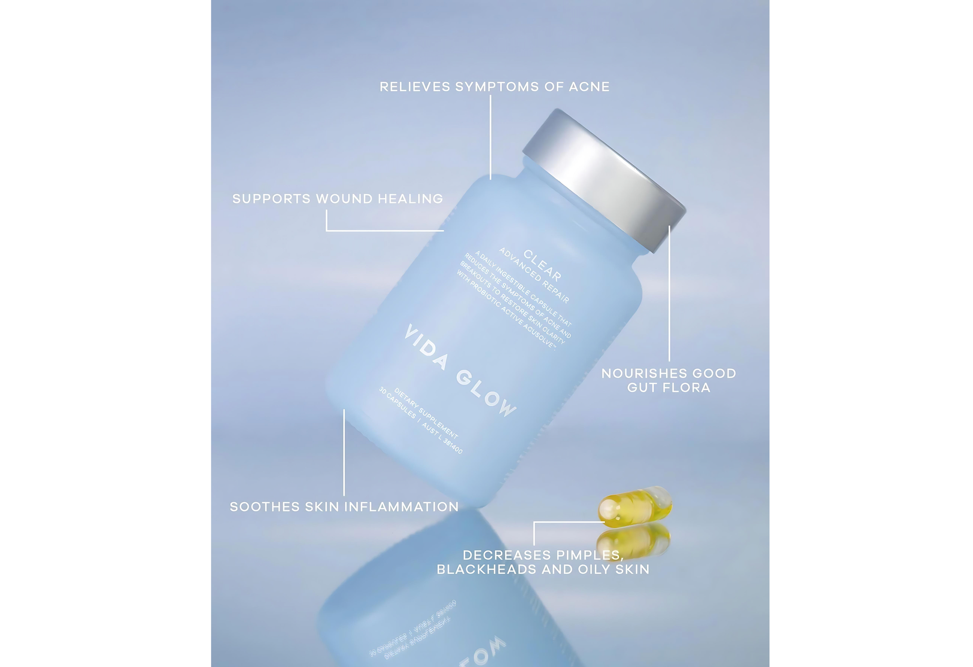 Clear is a once-daily ingestible capsule designed to reduce acne, blackheads, excess oil, and skin inflammation. Formulated for both men and women, it works systemically to address the root causes of breakouts linked to hormones, stress, diet and gut imbalances.
